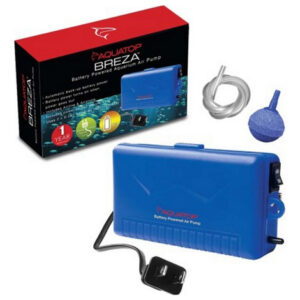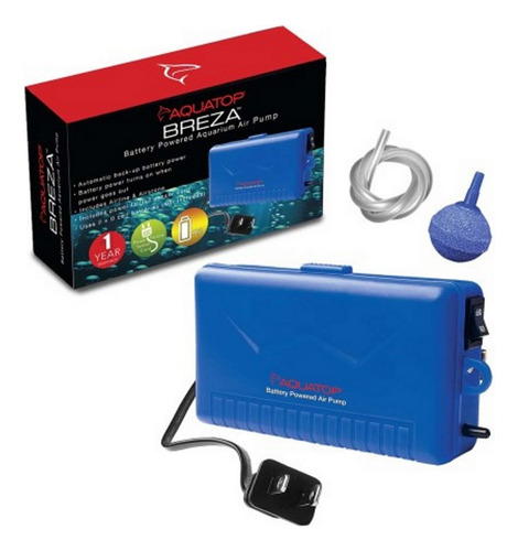 A bomba de ar operada por bateria Aquatop AC/DC-One fornece ar auxiliar quando uma fonte de ar principal falha. É uma fonte de ar de reserva confiável durante uma falha de energia elétrica doméstica e também pode ser usada como aerador portátil para peixes em trânsito. Vem com uma pedra pneumática, 23 tubos e um sensor de falha de energia AC. Usa duas baterias de células D (não incluídas).