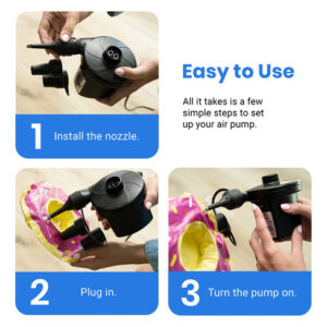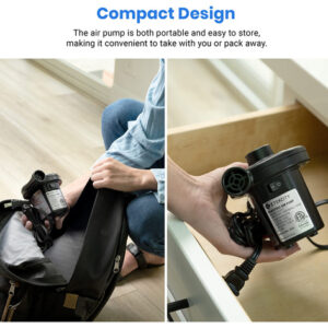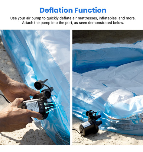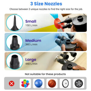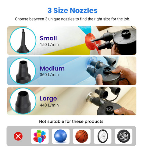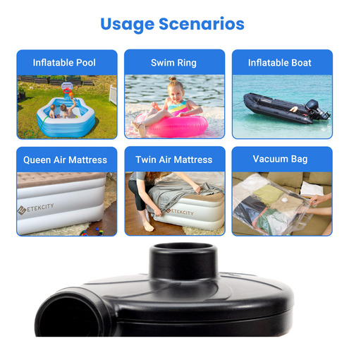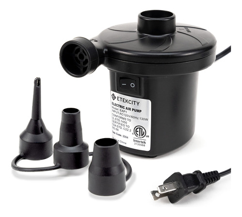 Colchão de ar com bomba de ar elétrica Etekcity Bomba portátil para sofá inflável, flutuadores de piscina, balsa inflável, barco, deflator AC de enchimento rápido com 3 bicos, 110-120 volts, preto – DESEMPENHO DE ALTA QUALIDADE: os designs da bomba de ar elétrica com enchimento rápido e alta pressão permitem esvaziar e inflar eficientemente com potência nominal de 130 W e 0, 55 PSI (3800 Pa), maior do que a maioria das bombas manuais do mercado – BICOS INTERLIGADOS: a bomba de ar com cabo de alimentação CA extra longo de 1,6 m/5,3 pés e 3 tamanhos diferentes de bicos –S (0,28"), M (0,68"), L (0,71") — pode acomodar a maioria dos insufláveis de que você precisa; os bicos da bomba portátil permanecem trancados sem perder ar – COMPACTA E LEVE: a bomba de ar é fácil de embalar e transportar em um tamanho pequeno de 4,7 x 3,7 x 4,5 polegadas, até mesmo crianças podem usá-la facilmente – Design exclusivo de isolamento acústico: esta bomba de ar usa um design de roda avançado e impulsores de metal de alta qualidade, o que reduz bastante o ruído em operação; Ótima para colchões de última hora configuração quando outras pessoas próximas já estão descansando – OPERAÇÃO FÁCIL: A bomba de ar elétrica torna a inflação e a desinflação rápidas e fáceis sem bombear manualmente, economize tempo e energia – USO VERSÁTIL: as bombas de ar Etekcity ajudam você a economizar tempo inflando colchões/colchões de ar, flutuadores de piscina, piscinas infláveis, brinquedos de piscina, móveis infláveis, anéis de natação e muito mais – NOTA: NÃO as use para inflar produtos de alta pressão, como balões, bolas de basquete, jangadas, bolas de ioga e pneus