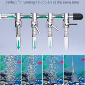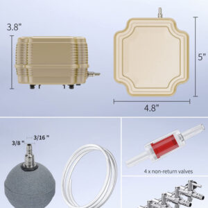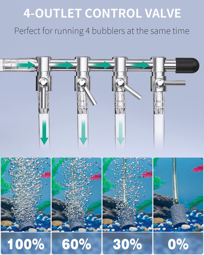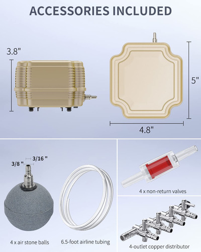 Acessórios da bomba: vem com 4 esferas de pedra pneumática, 4 válvulas de retenção de plástico vermelho, um divisor de 4 saídas feito de cobre cromado e 1 tubo de ar de 6,5 pés.