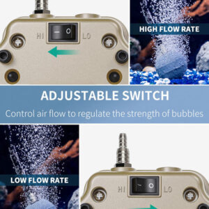 ar ajustável: O interruptor de modo alto/baixo na parte inferior da bomba de ar permite regular e escolher o ar desejado fluxo. Ideal para oxigenar seus tanques.
