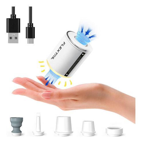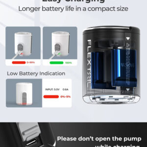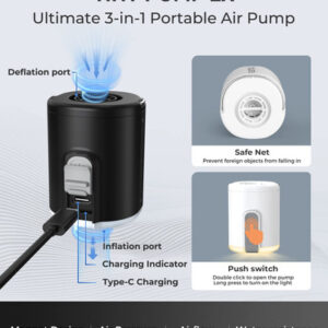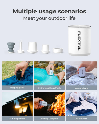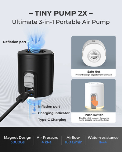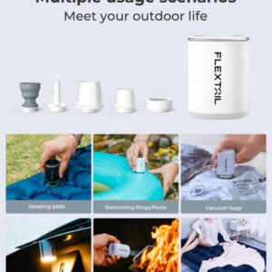 tiny pump 2X – COMPACT BUT MORE POWERFUL THAN EVER- Weights 3.3oz(only the pump), FLEXTAILGEAR portable air pump TY2X maintains almost the same size as the previous generation, but allows the air pressure to be further enhanced to 4 kPa(0.58 PSI). Able to inflate tens of single camping air mattress, air pillows, or keep the camping lantern on for about 10 hours at 40 lumens in a single charge. (NOT SUITABLE FOR BALLOONS, BASKETBALLS OR TIRES!) – MAGNETIC DESIGN & CAMPING LANTERN- The built-in magnet ring, allows our mini pump to be strongly attracted by iron, steel, nickel, and other ferromagnetic material. Combined with the function of magnetic ring and camping light, our battery air pump can be fixed in more places to provide lightings, such as cars, iron frames, or other camping equipment.(Please make sure the material can be magnetically attracted) – MINI SIZE & ULTRA-LIGHT- Size only 1.8 x 1.7 x 2.3, our travel air pump an be easily placed in any corner of your backpack or pocket. By upgrading the structure and circuitry, the battery life of the small air pump has been increased to 25 minutes with such a compact size. Please dont use continuously for more than 15 minutes – OPTIMIZED DESIGN AND STRUCTURE- Redesigned air inlet and outlet, the deflation and inflation port are optimized to the top and bottom, which makes it much easier to hold and operate and the improved air ducts are more conducive to ventilation and heat dissipation. Hooks are designed to be consealed, further increasing portability(Double click to start the air pump and long press to open the led light) – 5 NOZZLES & DIVERSE USE- Come with 5 nozzles, the battery powered air pump is suitable for most small-large sized inflatable products, such as air mattresses, inflatable beds, pool floats, sleeping pads, swim rings, inflatable furniture, pool inflatables and other inflatable toys. Not only supports inflation, but also deflation air from the storage bags