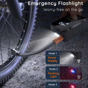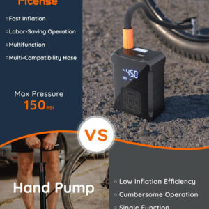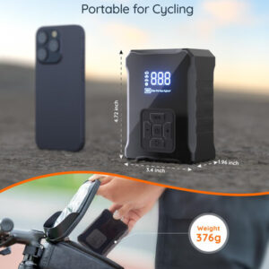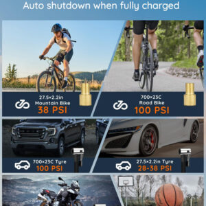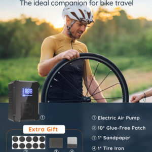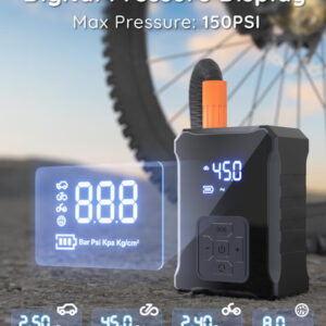 Bomba de bicicleta Fitense com manômetro digital, bomba de bicicleta elétrica portátil, inflador de pneus de carro, máximo de 150 PSI, bomba de ar de desligamento automático com válvulas Presta e Schrader para bicicletas, motocicletas e carros – Máximo de 150 PSI: a bomba de ar Fitense tem quatro unidades de pressão para escolher (PSI, BAR, KPA e KG/CM). Com vários acessórios incluídos — Presta, válvulas Schrader e uma agulha esférica. Além disso, equipado com um kit de remendo de pneus para lidar com quebras acidentais de pneus. É adequada para carros, motocicletas, mountain bikes e bicicletas de estrada – Portátil e leve: a bomba de ar portátil apresenta um design compacto e sem fio que permite levá-la facilmente para qualquer lugar. Vem com uma bolsa de armazenamento para facilitar o armazenamento. Pesando apenas 376 gramas, seu tamanho compacto o torna altamente adequado para armazenamento em seu carro, bicicletário ou mochila – Bomba de ar eficiente e poderosa para bicicletas: este compressor de ar portátil para pneus de automóveis é uma ótima solução para emergências a caminho. Um motor potente que pode inflar rapidamente um pneu de carro 195/65 R15 de 22 PSI a 36 PSI em 3 minutos. Além disso, são necessários apenas 90 anos para encher um pneu de bicicleta de estrada 700* 32C de 0 a 120 PSI – Design de desligamento automático: fique tranquilo com o design de desligamento automático. Esta bomba de ar parará automaticamente quando atingir a pressão predefinida. Chega de inflar demais, é simples e seguro. Ele também tem a função de medir a pressão dos pneus, você pode saber exatamente a pressão atual dos pneus – Luz LED conveniente e banco de energia: a bomba de ar tem uma luz LED na parte superior para transformá-la em uma fonte de energia de emergência no escuro e uma porta de entrada USB-C e uma porta de saída USB-A na parte superior para reverter a fonte de alimentação e usá-la como banco de energia para seu telefone celular