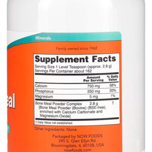 O Bone Meal (Farinha de Osso) da Now Foods é uma excelente fonte de cálcio, essencial para a manutenção óssea e dentária. Este suplemento é derivado de ossos bovinos cuidadosamente selecionados e processados para garantir uma alta concentração de cálcio natural.