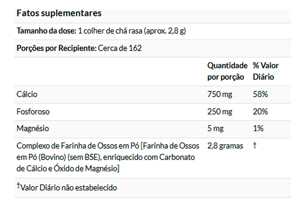 O Bone Meal em pó é versátil e pode ser facilmente adicionado a alimentos ou bebidas. Sua forma em pó permite uma dissolução fácil, tornando-o um complemento prático para smoothies, sucos, sopas ou qualquer outra receita, facilitando a ingestão diária recomendada de cálcio.
