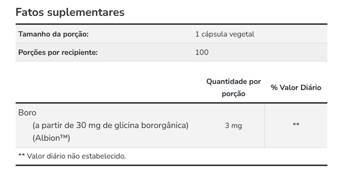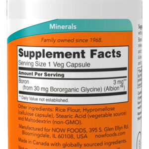 1. Suporte Nutricional Eficiente: Boron da Now Foods é formulado para fornecer 3mg de boro por cápsula, um mineral essencial que suporta diversas funções metabólicas e fisiológicas. Este suplemento é projetado para complementar sua dieta, ajudando a manter o equilíbrio de minerais no corpo.