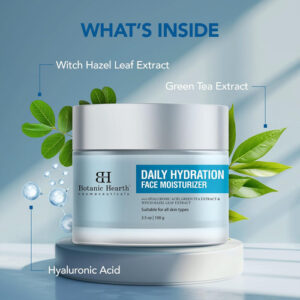 longa duração: o hidratante facial diário Botanic Hearth fornece hidratação profunda que mantém a pele fresca e carnuda graças ao ácido hialurônico. Leve e não pegajoso: sua textura leve é rapidamente absorvida, deixando a pele macia, nutrida e não pegajosa. Ingredientes naturais para a pele: Formulado com extratos de chá verde e hamamélis, este creme acalma a pele e ajuda a controlar o excesso de oleosidade. Feito de forma ética: livre de crueldade, livre de produtos químicos agressivos ou alérgenos e com ingredientes de origem responsável.