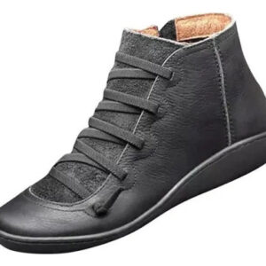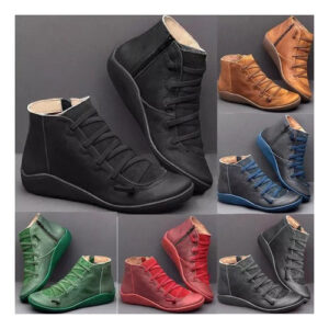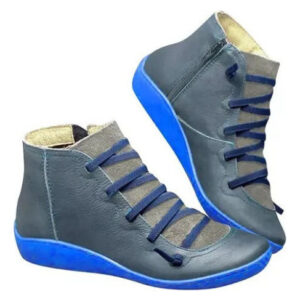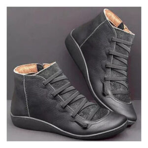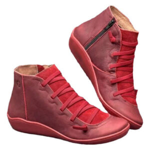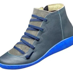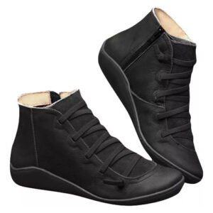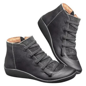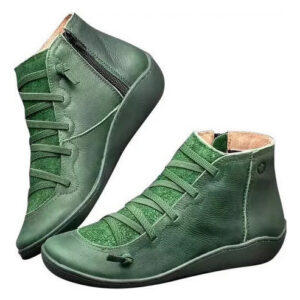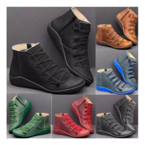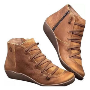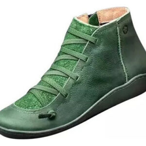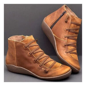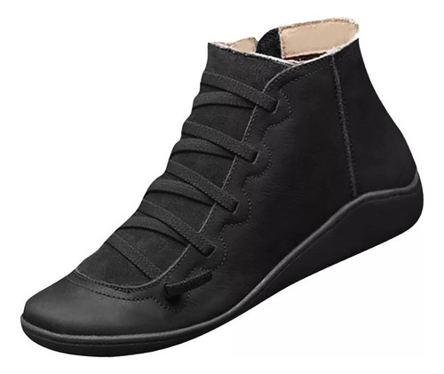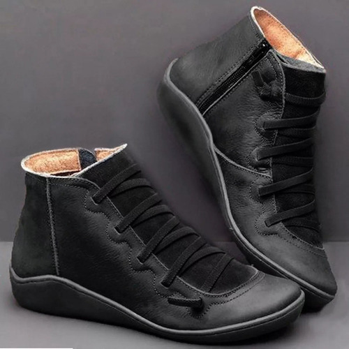 Botas femininas casuais de couro liso retrô com cadarço lateral com zíper e botas de sapato