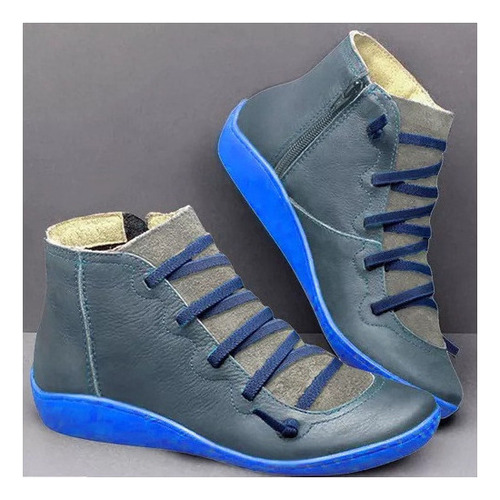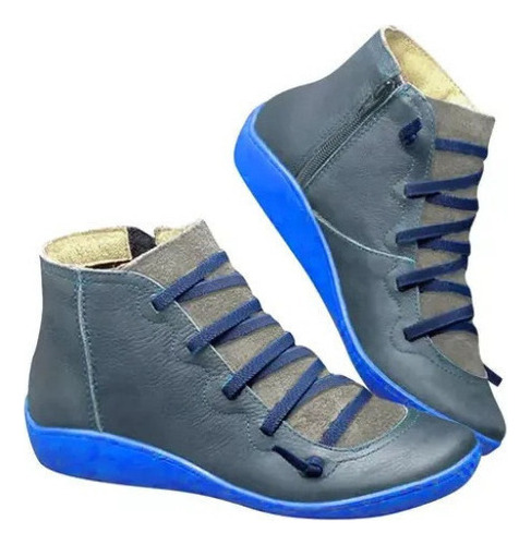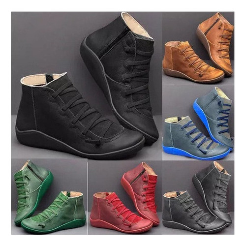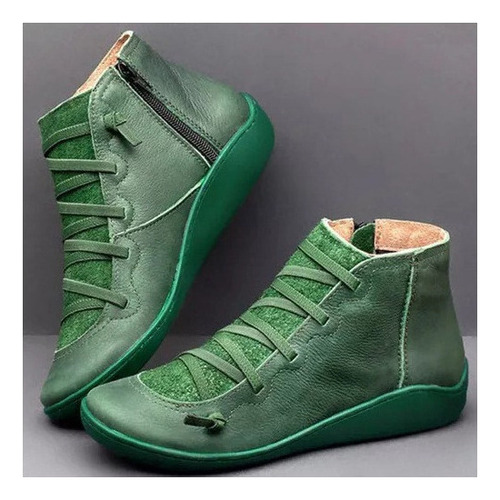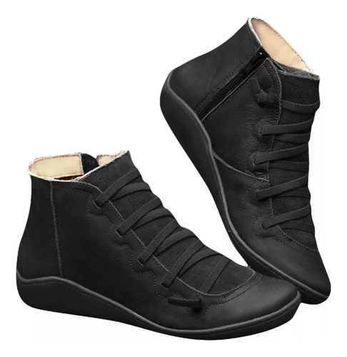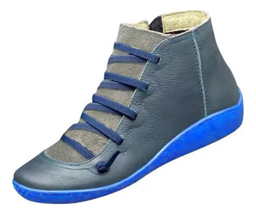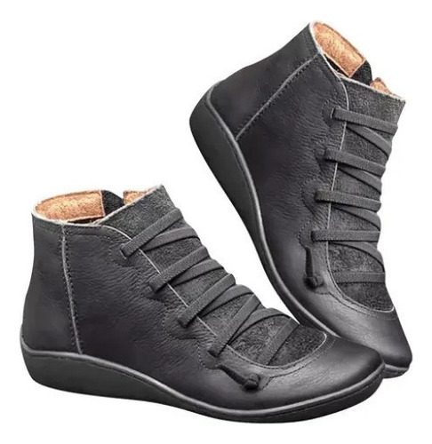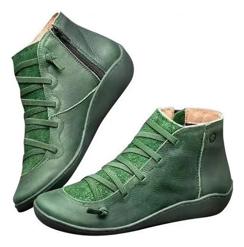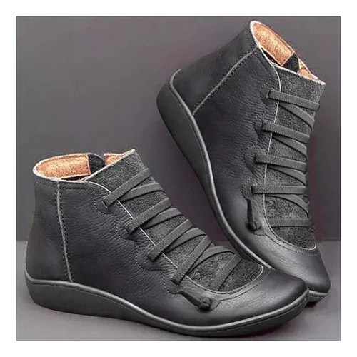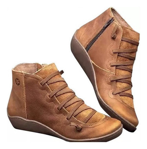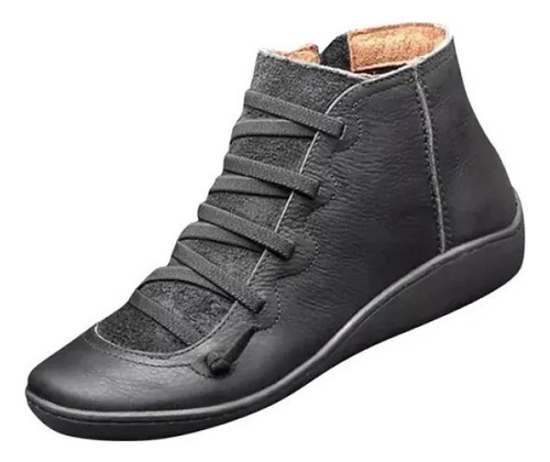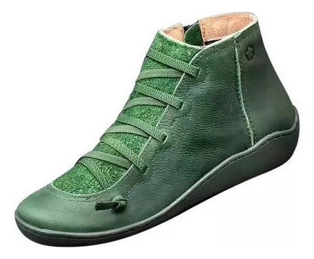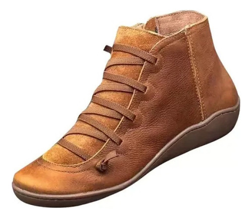 Modelo: X Botas Femininas De Couro Plano Retrô Com Cordões Laterais