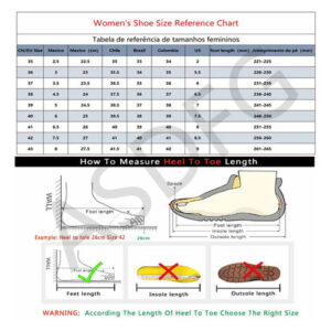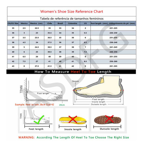 Encontre o tamanho que combina com você. Se você tem pés mais grossos ou mais gordos, é recomendável escolher um tamanho maior. (Por exemplo, o comprimento do pé é 22,5 cm e o tamanho correspondente é: EU 35 = MX2,5 = BR 33, mas seu peito do pé é mais grosso ou mais gordo. Em seguida, escolha um tamanho maior: EU 36 = MX3 = BR 34). Depois de fazer um pedido, nós o enviaremos imediatamente e aguardamos sua atenção e compra.
