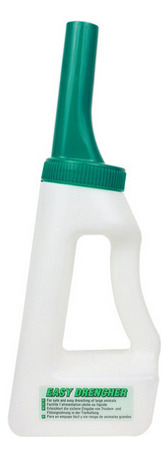 A garrafa de imersão para gado possui gargalo largo para facilitar o enchimento de líquidos ou pós, alça fácil de segurar e bocal seguro de 12 cm de comprimento. Possui 1,2 litros, graduados em incrementos de 100 ml. Administre no lado da boca para o posicionamento correto da sonda.