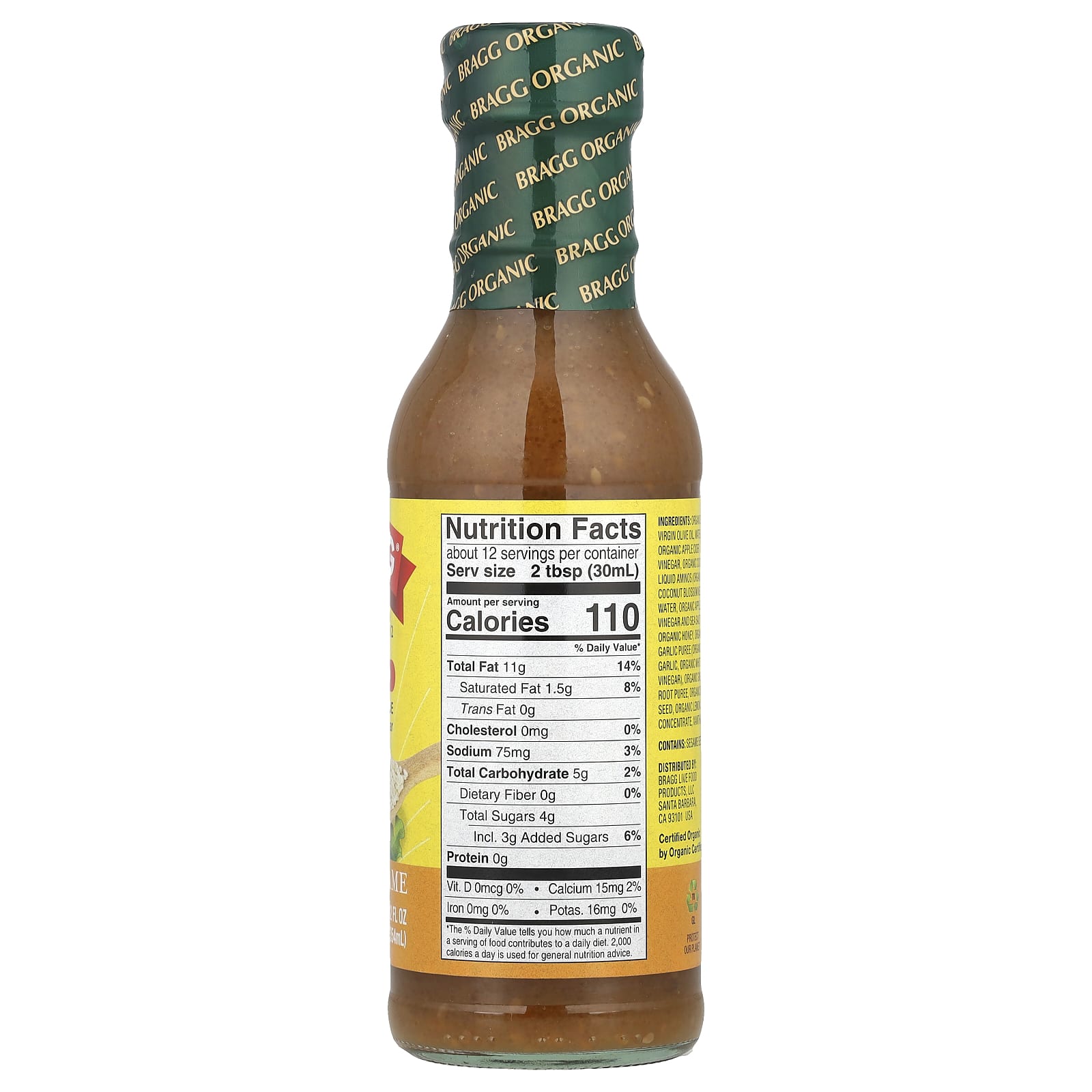 Óleo de oliva extravirgem orgânico, água, vinagre de sidra de maçã orgânico, aminoácidos líquidos de coco orgânico (néctar da flor de coco orgânico, água, vinagre de sidra de maçã orgânico e sal marinho), mel orgânico, purê de alho orgânico (alho orgânico, vinagre branco orgânico), purê da raiz de gengibre orgânico, semente de gergelim orgânico, concentrado de suco de limão orgânico, goma xantana.