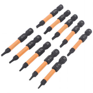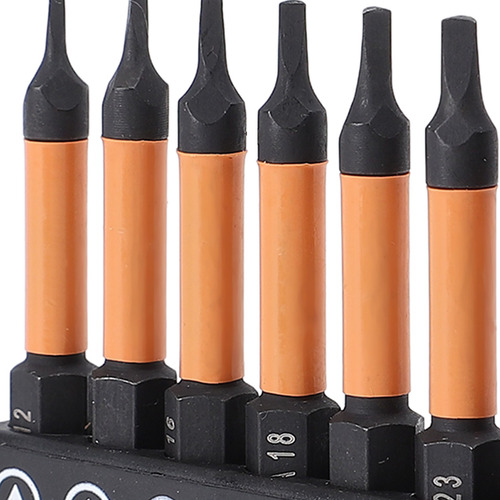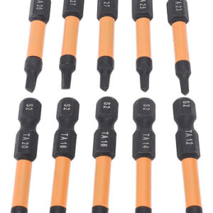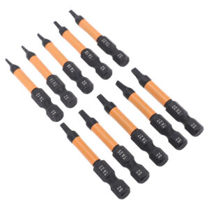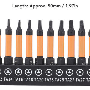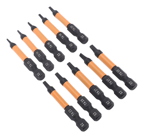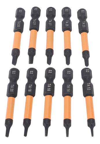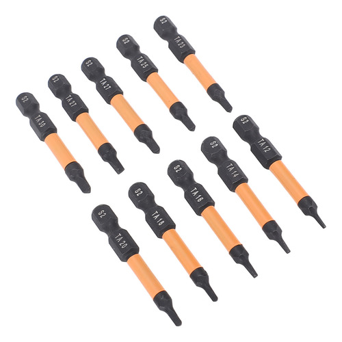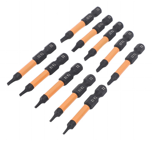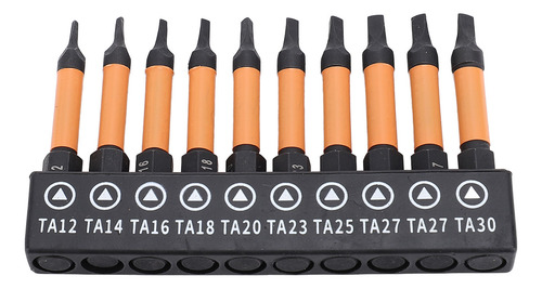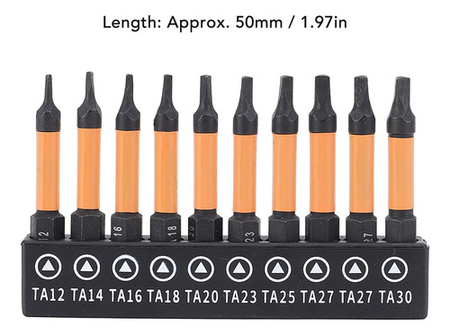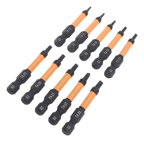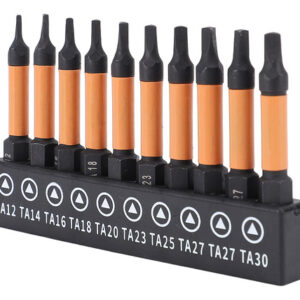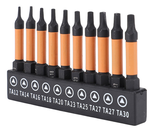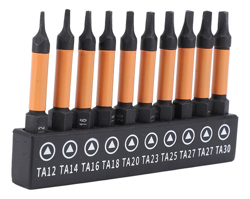 Conjunto de 10 peças Este conjunto de brocas de chave de fenda triangulares inclui 10 tamanhos (TA12, TA14, TA16, TA18, TA20, TA23, TA25, TA27x2, TA30), com 50 mm de comprimento e haste hexagonal de 1/4 de polegada. Material de aço S2 Fabricadas em aço S2, usinadas e endurecidas em CNC, essas chaves de fenda triangulares têm alta resistência, não são fáceis de quebrar, garantindo um uso duradouro. Design magnético As brocas magnéticas permitem a fácil recuperação do parafuso, evitando que as peças caiam. Adequadas para processamento fino, o ímã não corroerá após vários usos. Aplicação ampla Adequado para montagem de móveis, garagem, automóveis, bicicletas, encanamento, construção e outras aplicações de manutenção.