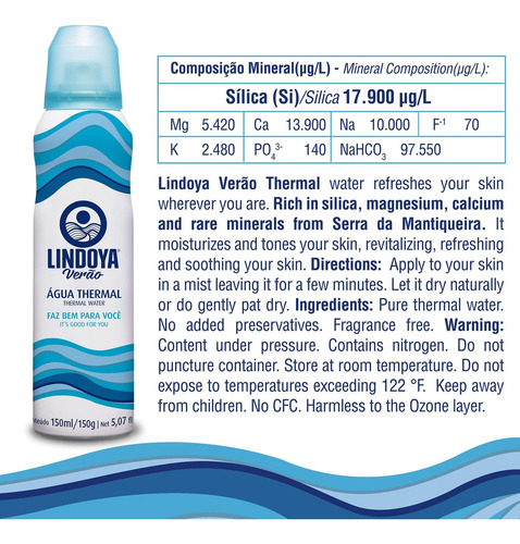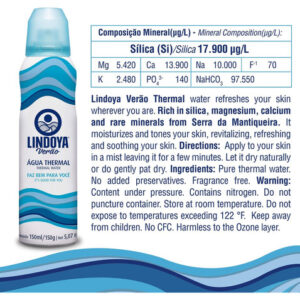 LINDOYA THERMAL SPRING WATER refresca sua pele e cabelo onde quer que você esteja. Rica em sílica, magnésio, cálcio e minerais raros, essa água termal hidrata e nutre profundamente a pele e o cabelo. Perfeito para usar entre as etapas de sua rotina de cuidados faciais, ele ajuda a misturar e revitalizar a maquiagem, oferecendo um acabamento impecável. Ideal para uso durante e após a exposição ao sol, acalma e suaviza a pele após o barbear. Sua fórmula suave é perfeita para peles sensíveis e segura para uso em crianças.