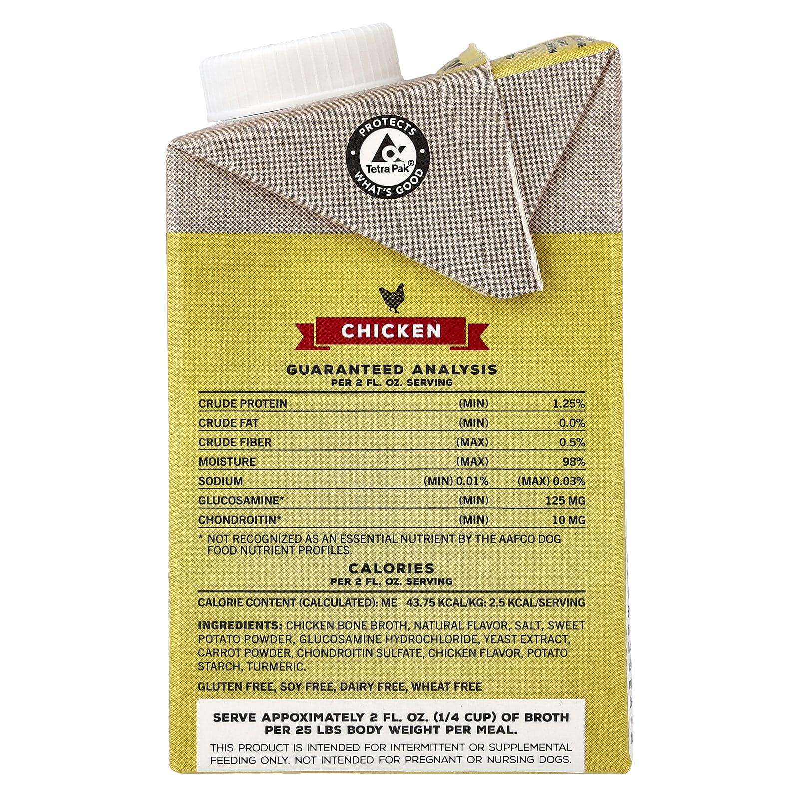 Guia de alimentação para adultos: Sirva como um suplemento diário saudável (aqueça conforme desejado). Despeje sobre a comida do seu cão em cada refeição. Também pode ser consumido como uma bebida nutritiva e hidratante. Sirva aproximadamente 1/4 de xícara de caldo por cada 25 lb de peso corporal por refeição. Ajuste a quantidade de acordo com as necessidades individuais de cada animal de estimação.