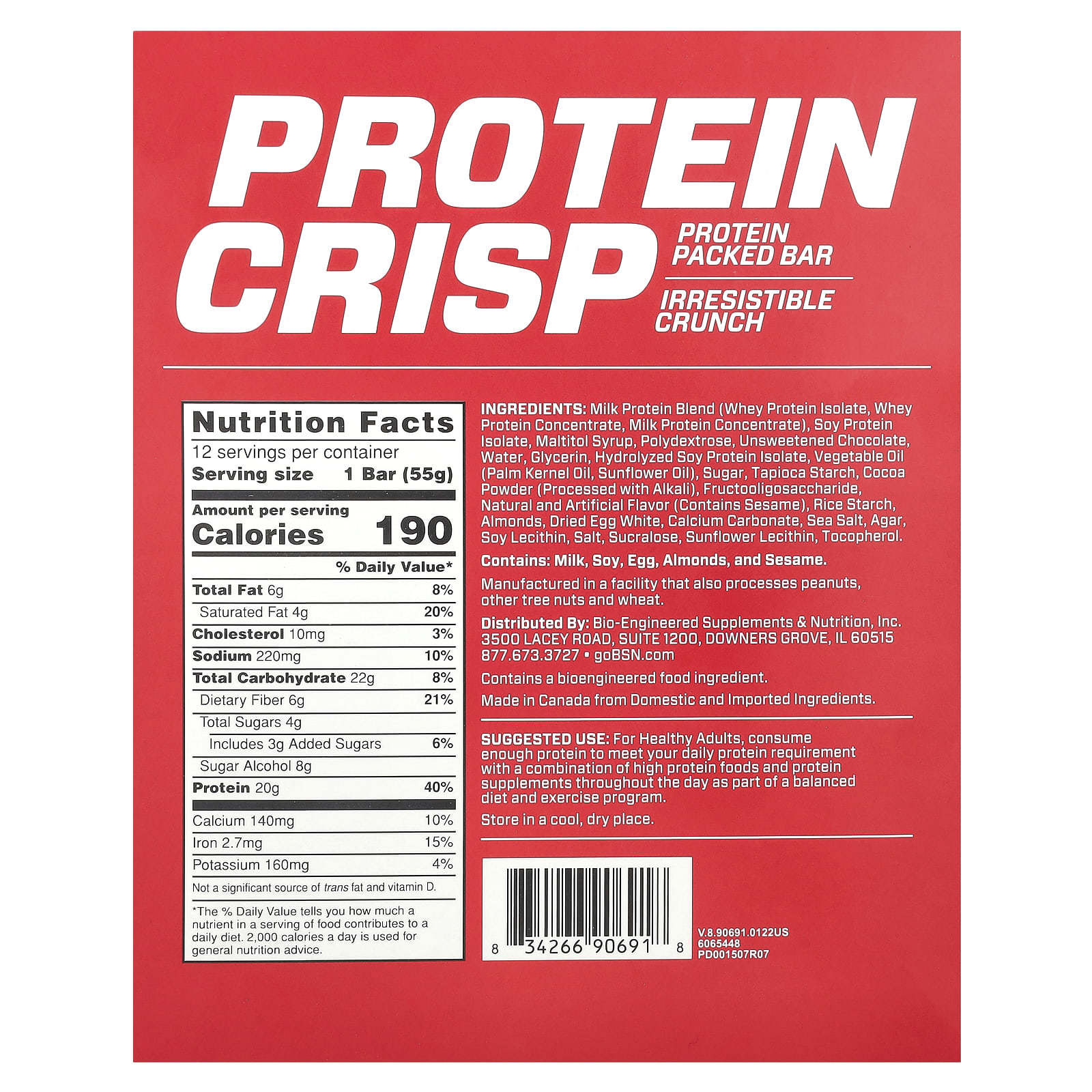 Rebentar na sala de musculação não significa punir suas papilas gustativas durante a recuperação. Recompensa-se com a Barra Protein Crisp da BSN, uma combinação séria de sabor incrível e textura única sem comprometer seus macros. Com apenas 230 calorias, cada Barra Protein Crisp contém 20 g de proteínas premium e 4 g de açúcar ou menos. E com uma textura leve e crocante e repleta do sabor clássico em cada crocância, todos os dias serão com o mesmo sabor. Saboreie vários sabores deliciosos para preparar um lanche ultraprático e repleto de proteínas entre as refeições, após o treino ou sempre que sentir vontade de comer algo em qualquer lugar. Você ganhou.