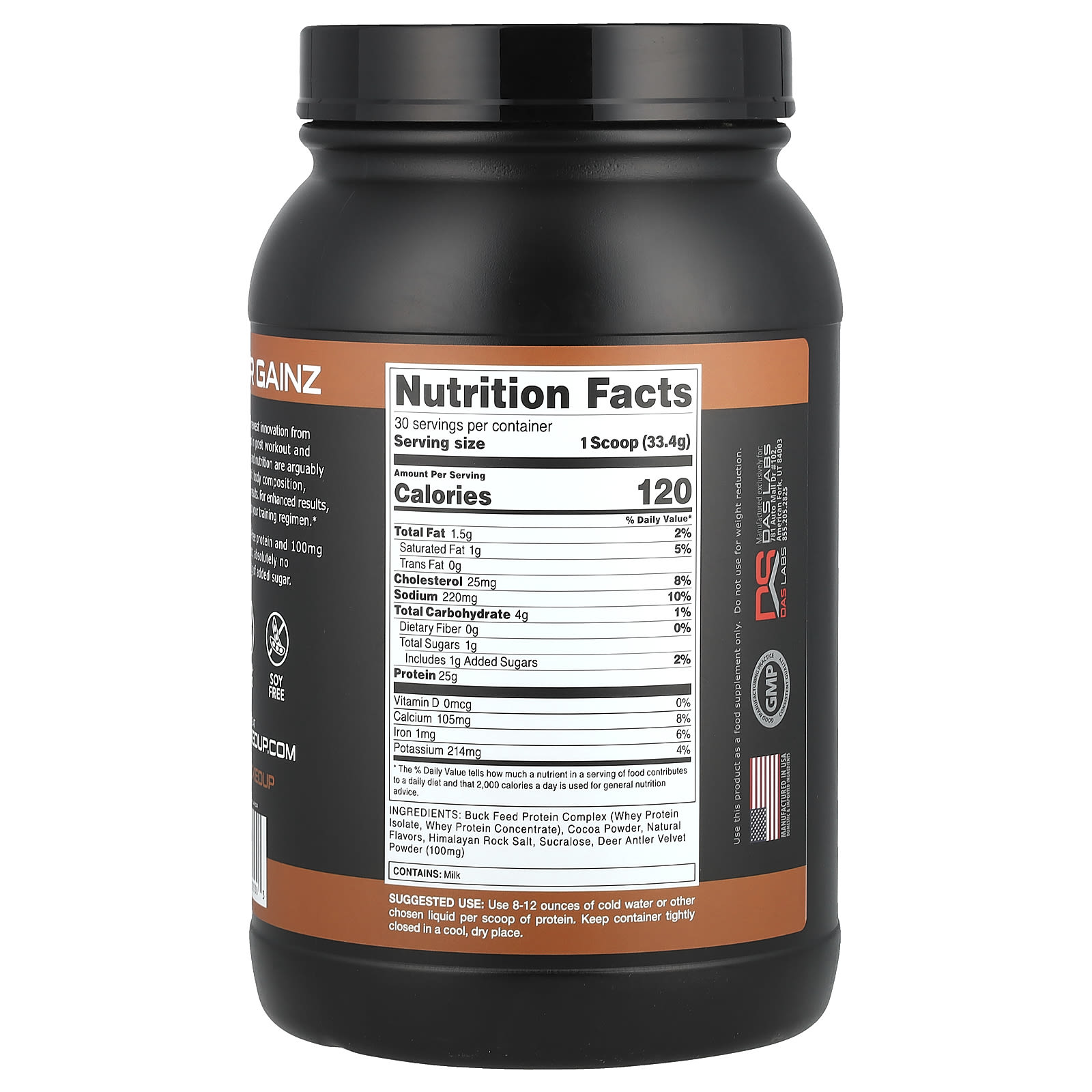 Enriquecido com 25 g de proteína sem hormônios e 100 mg de extrato de veludo de chifre de veado, sem corantes artificiais e com apenas 1 g de açúcar adicionado.