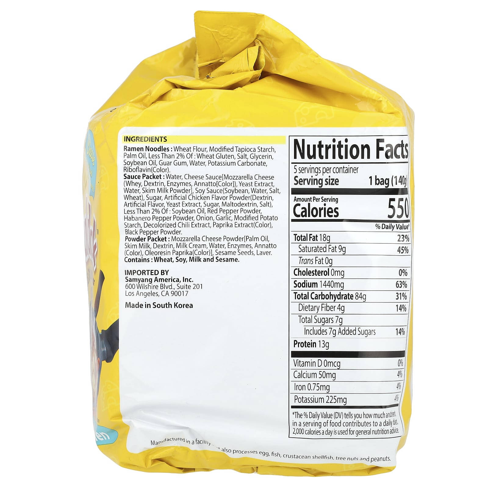 Pacote de molho: água, molho de queijo[queijo mussarela (whey, dextrina, enzimas, anato[cor]), extrato de levedura, água, leite em pó desnatado], molho de soja(soja, água, sal, trigo), açúcar, pó de sabor artificial de frango (dextrina, sabores artificiais, extrato de levedura, açúcar, maltodextrina, sal), menos de 2% de: óleo de soja, pimenta vermelha em pó, pimenta habanero em pó, cebola, alho, amido de batata modificado, extrato de pimenta descolorada, extrato de páprica (corante), pimenta-do-reino em pó.