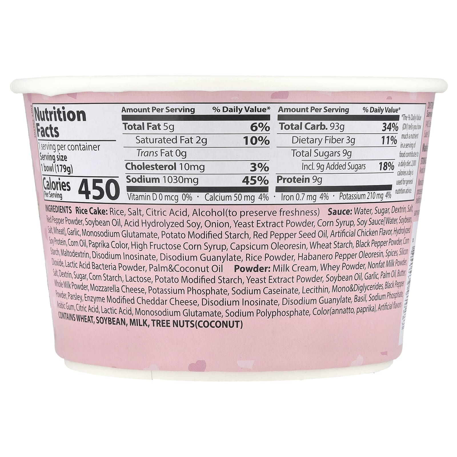 Bolo de Arroz: Arroz, sal, ácido cítrico, álcool (para preservar o frescor). Molho: Água, açúcar, dextrina, sal e pimenta vermelha em pó, óleo de soja, soja hidrolisada ácida, cebola, extrato de fermento em pó, xarope de milho, molho de soja [água, soja, sal, trigo], alho, glutamato monossódico, amido modificado de batata, óleo da semente de pimenta vermelha, sabor artificial de frango, proteína de soja hidrolisada, óleo de milho, corante de páprica, xarope de milho com alto teor de frutose, oleorresina de Capsicum, amido de trigo, pimenta-do-reino em pó, amido de milho, maltodextrina, inosinato dissódico, guanilato dissódico, arroz em pó, oleorresina de pimenta habanero, especiarias, dióxido de silício, pó da bactéria do ácido láctico, palma & óleo de coco. Pó: Creme de leite, whey em pó, leite em pó desnatado, sal, dextrina, açúcar, amido de milho, lactose, amido modificado de batata, extrato de fermento em pó, óleo de soja, alho, óleo de palma, manteiga, leite em pó integral, queijo mussarela, fosfato de potássio, caseinato de sódio, lecitina, mono e diglicerídeos, pimenta-do-reino em pó, salsa, queijo cheddar modificado com enzimas, inosinato dissódico, guanilato dissódico, manjericão, fosfato de sódio, goma arábica, ácido cítrico, ácido láctico, glutamato monossódico, polifosfato de sódio, corante(urucum, páprica), sabores artificiais.