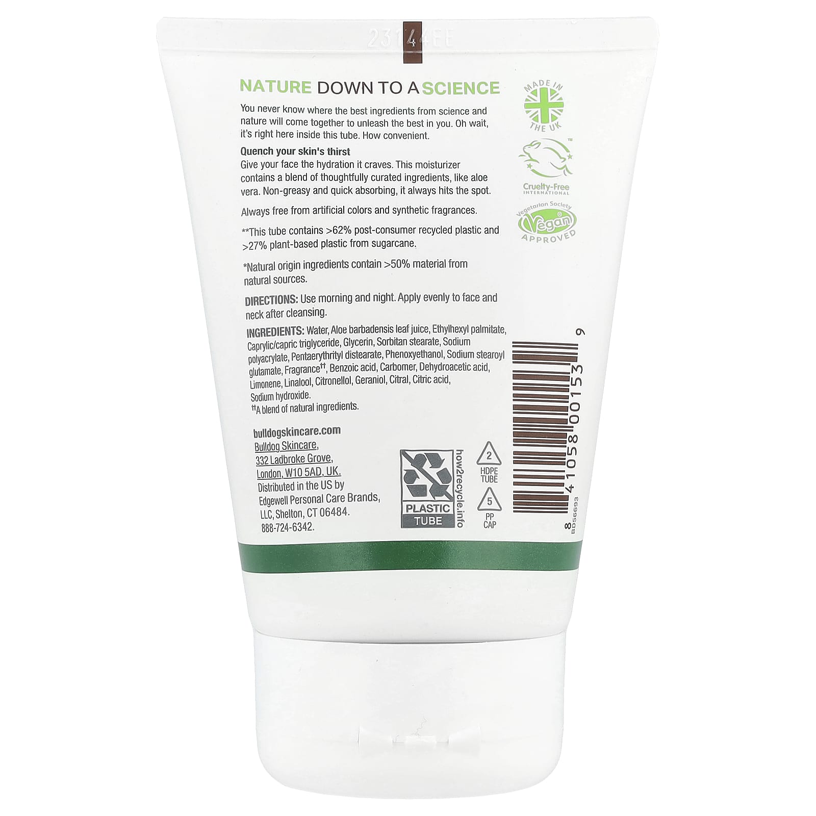 Água, palmitato etilhexílico, triglicérides caprílico / cáprico, glicerina, suco de folha de aloe barbadensis, estearato de sorbitano, poliacrilato de sódio, diestearato de pentaeritritol, fenoxietanol, óleo de semente de camelina sativa, estearoil glutamato de sódio, fragrância *, ácido benzóico, carbômero, acetato de tocoferila, ácido desidroacético extrato de raiz de amorphophallus konjac, extrato de folha de camellia sinensis (chá verde), hidróxido de sódio, sorbato de potássio, benzoato de sódio, tocoferol, ácido cítrico.