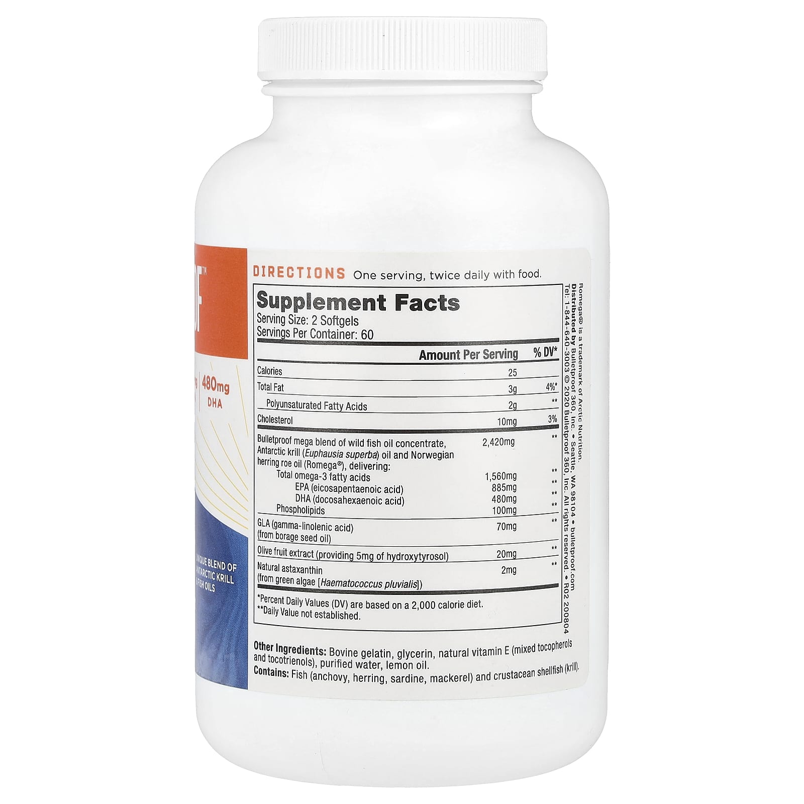 | Megamistura à prova de balas de concentrado de óleo de peixe selvagem, Óleo de Krill Antártico (Euphausia superba) e óleo de Krill Norueguês óleo de ova de peixe (Romega®), fornecendo: Ácidos graxos ômega-3 totais EPA (ácido eicosapentaenoico) DHA (ácido docosahexaenoico) Fosfolipídeos |