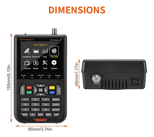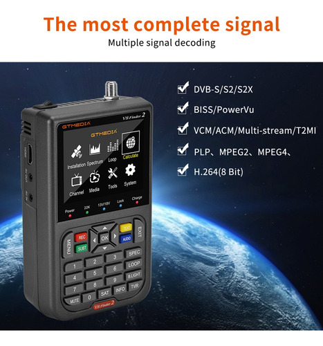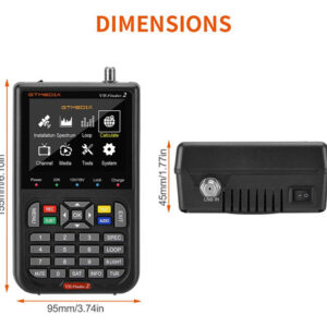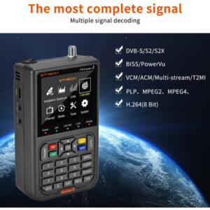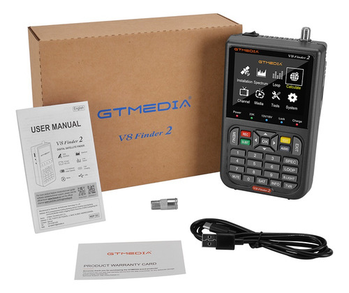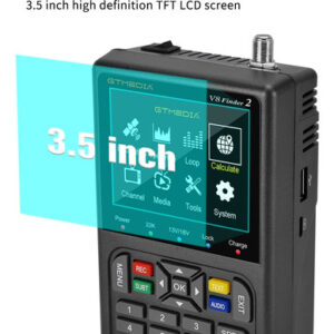 O Gtmedia V8 finder2 é um medidor de satélite portátil compatível com DVB – S/S2 e MPEG – 2/4 H.264 (8 bits). Este localizador de satélite é um medidor para medir a intensidade e a qualidade do sinal digital. Fornece todas as funções necessárias para a instalação e verificação do serviço de TV satelital digital em casas ou prédios de apartamentos, e suporta a pré – configuração de todas as informações do satélite. É compacto e leve, mas possui uma interface de usuário intuitiva, uma bateria duradoura e uma ampla funcionalidade que o tornam uma ótima ajuda portátil e prática para a detecção de satélites. O localizador de satélites V8 finder2 vem com uma bolsa de ombro portátil que permite que você tenha as mãos livres enquanto procura ou configura o satélite. Ideal para técnicos, instaladores ou entusiastas, este dispositivo compacto simplifica o alinhamento do satélite, a análise do sinal e a configuração do sistema com suas características avançadas e interface de usuário amigável.