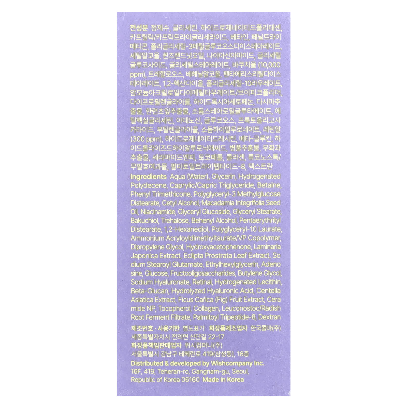 Aqua (água), glicerina, hydrogenated polydecene, caprylic/capric triglyceride, betaína, fenil trimetilone, polyglyceryl-3 methylglucose distearate, álcool cetílico, óleo da semente de Macadamia integrifolia, nicotinamida, glyceryl glucoside, monoestearato de glicerila, bakuchiol, trealose, behenyl alcohol, pentaerythrityl distearate, 1,2-hexanediol, polyglyceryl-10 laurate, ammonium acryloyldimethyltaurate/vp copolymer dipropylene glycol, hydroxyacetophenone, extrato de Laminaria japonica, extrato da folha de Eclipta prostrata, sodium stearoyl glutamate, ethylhexylglycerin, adenosina, glicose, fruto-oligossacarídeos, butilenoglicol, hialuronato de sódio, na retina, lecitina hidrogenada, betaglucano, ácido hialurônico hidrolisado, extrato de Centella asiatica, extrato da fruta de Ficus carica (figo), ceramida NP, tocoferol, colágeno, filtrado da fermentação da raiz de rabanete/leuconostoc, palmitoyl tripeptides-8, dextrano.