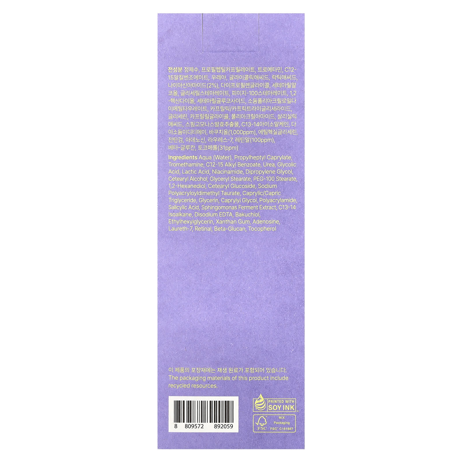 Aqua (água), propylheptyl caprylate, trometamol, c12-15 alkyl benzoate, ureia, ácido glicólico, ácido láctico, nicotinamida, dimetildietilenoglicol, álcool cetoestearílico, monoestearato de glicerila, estearato de PEG-100, 1,2-hexanediol, glicopiranosídeo cetoestearílico, sodium polyacryloyldimethyl taurate, caprylic/capric triglyceride, glicerina, caprylyl glycol, poliacrilamida, ácido salicílico, extrato de fermento de Sfingomonas, isoalcano c13-14, edetato dissódico, bakuchiol, ethylhexylglycerin, goma xantana, adenosina, laureth-7, na retina, betaglucano, tocoferol.