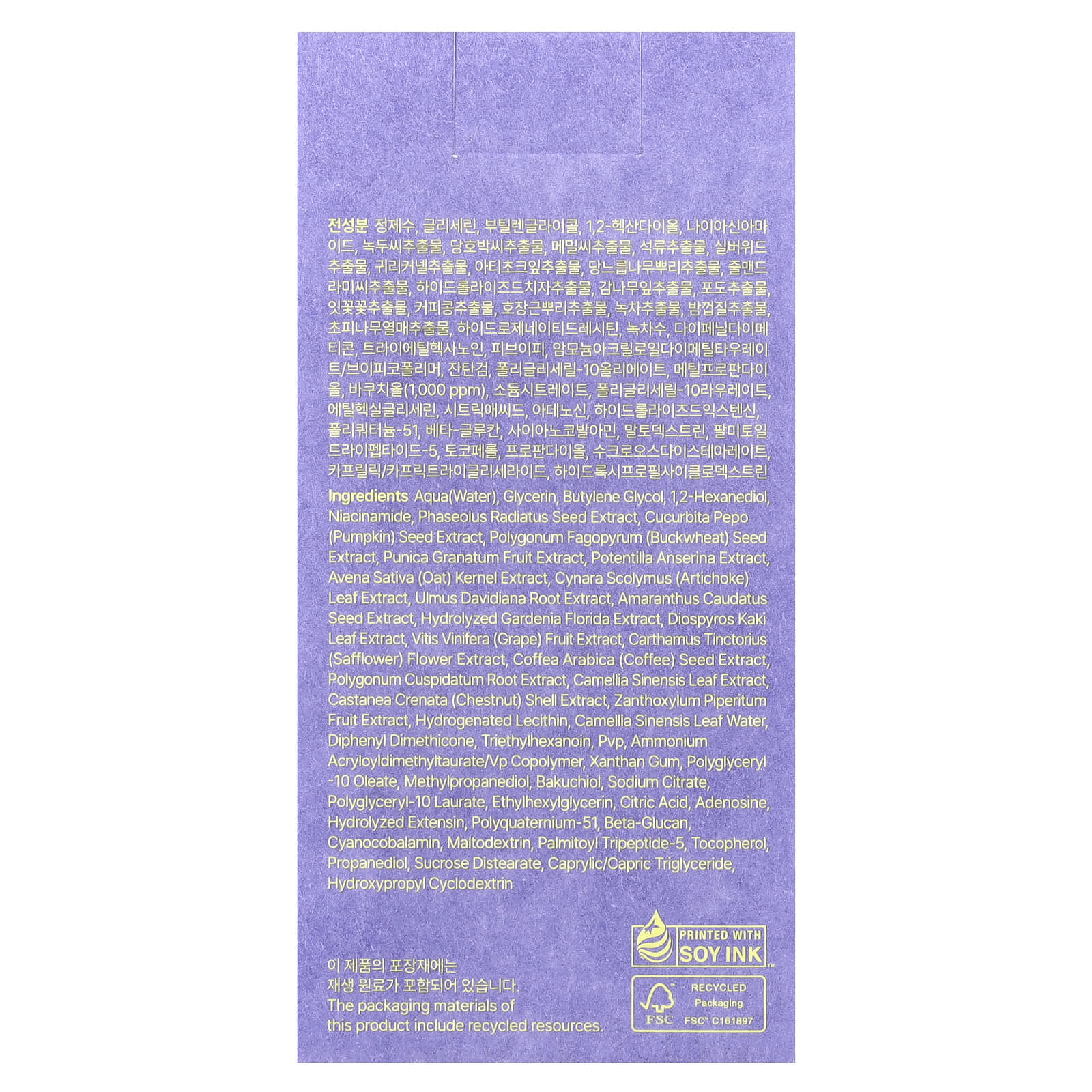aqua(água), glicerina, butylene glycol, 1,2-hexanediol, nicotinamida, extrato da semente de Phaseolus radiatus, extrato da semente de Cucurbita pepo e abóbora), extrato da semente de Polygonum fagopyrum (trigo sarraceno), extrato da fruta de Punica granatum, extrato de Potilla anserina, extrato de Avena sativa (aveia), Cynara scolymus (extrato da folha de alcachofra, extrato da raiz de Ulmus davidiana, extrato da semente de Amaranthus caudatus, extrato de Gardenia florida hidrolisado, extrato da folha de Diospyros kaki, extrato da fruta de Vitis vinifera (uva), extrato da flor de Carthamus tinctorius (cártamo), extrato da semente de Coffea arabica (café), extrato da raiz de Polygonum cuspidatum, extrato da folha de Camellia sinensis, extrato da casca de Castanhas crenata (castanha), extrato da fruta de Zanthoxylum piperitum, lecitina hidrogenada, folha de Camellia sinensis água difenil dimeticona, triethylhexanoin, PVP, ammonium acryloyldimethyltaurate/vp copolymer, goma xantana, oleato de poliglicerila-10, methylpropanediol, bakuchiol, citrato de sódio e polyglyceryl-10 laurate, ethylhexylglycerin, ácido cítrico, adenosina, extensina hidrolisada, poliquatérnio-51, betaglucano e cianocobalamina, maltodextrina, palmitoyl tripeptide-5, tocoferol, propanodiol, diestearato de sacarose, caprylic/capric triglyceride hydroxypropyl thermodextrin.