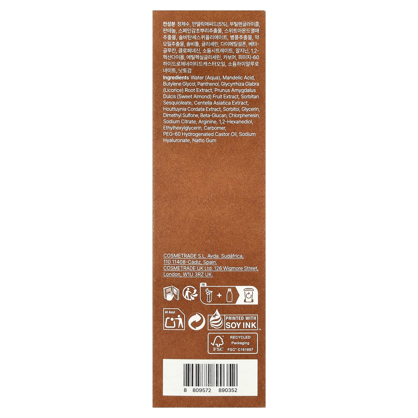 Água, ácido mandélico, butilenoglicol, pantenol, extrato da raiz de Glycyrrhiza glabra (alcaçuz), extrato da fruta de Prunus amygdalus dulcis (amêndoa doce), sesquioleato de sorbitana, extrato de Centella asiatica, extrato de Houttuynia cordata, sorbitol, glicerina, dimetilsulfona, betaglucano, clorfenesina, citrato de sódio, arginina, 1,2-hexanediol, ethylhexylglycerin, carbômero, óleo de rícino hidrogenado peg-60, hialuronato de sódio, goma natto.
