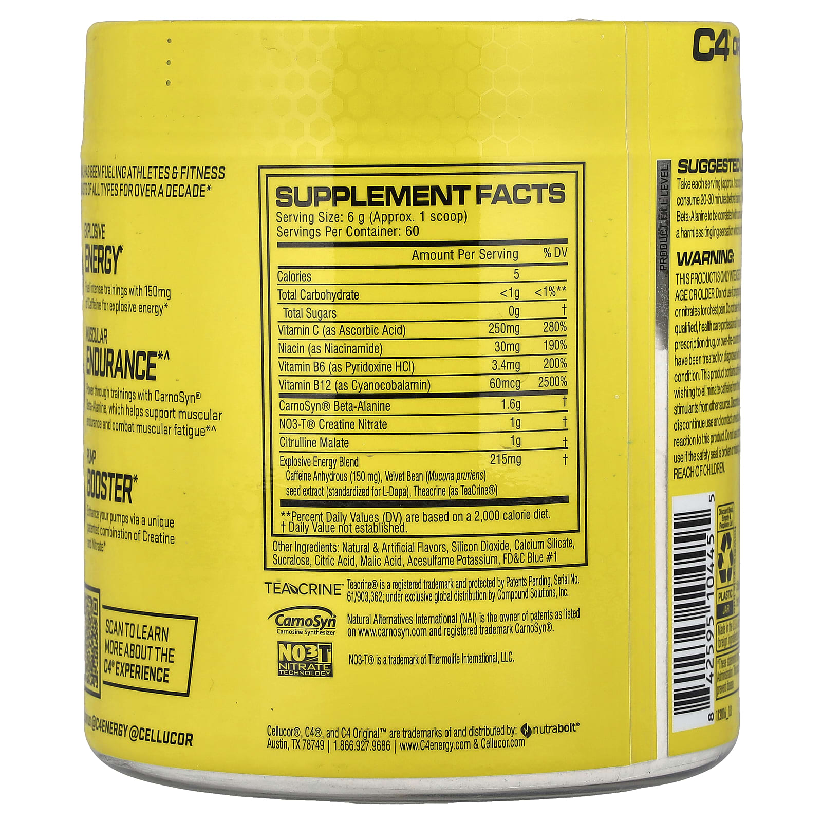 Tome uma porção (1 medida cheia) de C4 Original misturada com 177 ml de água, de 20 a 30 minutos antes do treino. Alguns indivíduos podem apresentar uma sensação inofensiva de formigamento, que é atribuída à beta alanina. Use somente conforme indicado.