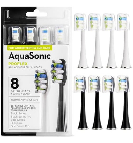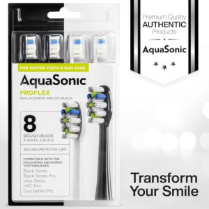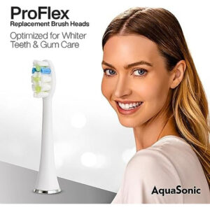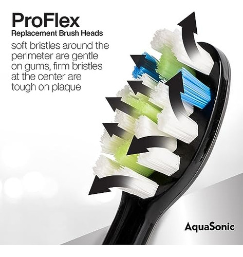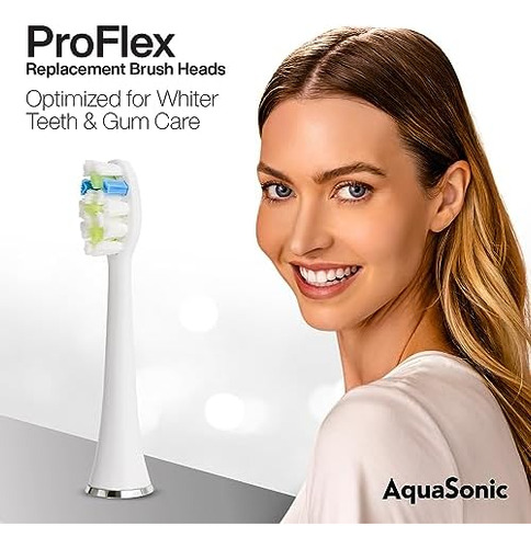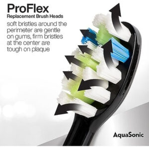 Cabeças de escova ProFlex – As cabeças de escova ProFlex aprimoradas da AquaSonic oferecem melhor remoção de placa bacteriana com cerdas em ângulo preciso com áreas duras e macias alternadas que são mais suaves para as gengivas e um pouco mais duras para os dentes