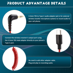 O conector de adaptador de áudio TRS para -C de 3,5 mm é para sistemas externos de microfone de lapela sem fio gravarem áudio em seu telefone celular.