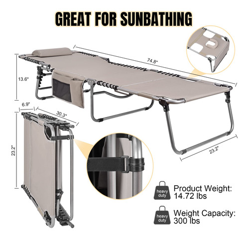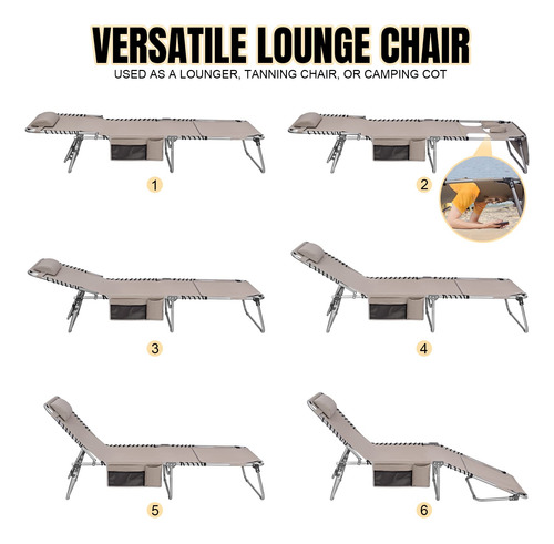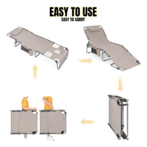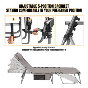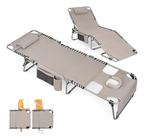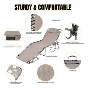 Cadeira de bronzeamento pesada com orifício facial ajustável de 5 posições, espreguiçadeiras dobráveis para exterior, espreguiçadeira de praia plana portátil para banhos de sol ao ar livre, pátio, piscina, gramado, deck de acampamento à beira da piscina – CADEIRA DE BRONZEAMENTO COM ORIFÍCIO FACIAL Esta cadeira de bronzeamento possui um orifício conversível de abertura/fechamento virado para baixo, fendas para braços e travesseiro. Uma prática espreguiçadeira para banhos de sol ao ar livre, à beira da piscina, pátio, gramado, jardim, praia e muito mais. Pode ser usada como berço de acampamento, espreguiçadeira ou cama de hóspedes. – ESPREGUIÇADEIRAS CONFORTÁVEIS AO AR LIVRE. Esta espreguiçadeira dobrável é larga e longa o suficiente para acomodar pessoas de até 6,2 pés, com ótimo espaço e conforto. O tecido é macio e respirável. O design ergonômico reduz a tensão muscular e o estresse, proporcionando o equilíbrio perfeito entre firmeza e maciez. – Espreguiçadeira externa ajustável de 5 posições A cadeira de layout vem com um sistema de travamento triangular, que permite escolher entre 5 níveis diferentes para conforto personalizado. A estrutura de travamento atualizada é robusta e confiável. – Cadeira HEAVY DUTY BEACH LOUNGE Com uma estrutura de aço espessa com revestimento em pó, a cadeira de praia é resistente o suficiente para acomodar pessoas de até 300 libras. A parte de conexão da parte do assento e da parte da estrutura do tubo adota um design de elástico duplo para fornecer suporte geral. Adota tecido oxford 600D mais revestimento de PU, tem a vantagem de durabilidade. A capa do apoio para os pés e as almofadas para os pés o tornam antiderrapante em superfícies duras. – FÁCIL DE USAR E PORTÁTIL. Crianças, adultos e idosos podem usá-lo facilmente. Apenas revele tudo e divirta-se. Com a alça de transporte embutida e a alça de ombro, a espreguiçadeira da piscina é conveniente para o transporte.