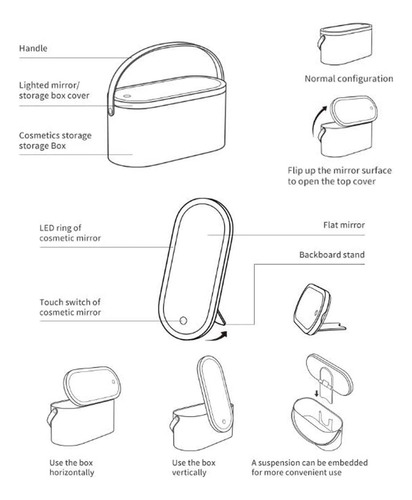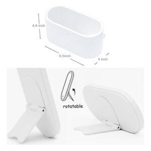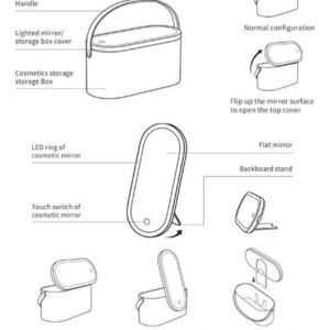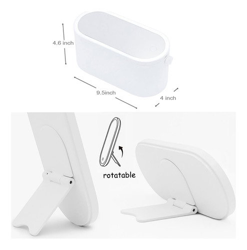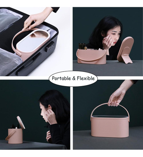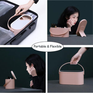 Estojo de maquiagem portátil multiuso com espelho iluminado por LED, uma boa combinação de organizador de maquiagem e espelho iluminado para maquiagem, que tem um círculo de luz ao redor. Ótimo para guardar cosméticos em casa e também portátil para levar em viagens. CAIXA DE MAQUIAGEM PORTÁTIL, a alça flexível torna a caixa de maquiagem confortável e fácil de transportar durante a viagem; o tamanho compacto facilita a colocação na bagagem. ESPELHO DE MAQUIAGEM FLEXÍVEL, o suporte de encosto do espelho permite que você o coloque da maneira que quiser, girando, vertical ou horizontalmente. LUZ INTELIGENTE, projetada com função de armazenamento de memória, o espelho iluminado lembrará o brilho em que foi ajustado da última vez e o mostrará novamente quando você o usar na próxima vez. Boa ideia para presente de aniversário, presente de Dia das Mães, presente de Dia dos Namorados, presente de Ação de Graças, presente de Dia dos Professores e surpresa de Natal. Temos certeza de que suas amigas, mães e irmãs vão adorar esta caixa de maquiagem multiuso. – Material de alta qualidade, feita de material ABS, nossa caixa de cosméticos chique é durável, não tóxica e prática, tem uma aparência elegante e inovadora, uma ótima ideia de presente para mães, mulheres, familiares e amigos – Medidas: 4,6 x 9,5 x 4, tamanho perfeito para acomodar vários cosméticos diários e compacta o suficiente para ser colocada na bagagem para levar a negócios ou viajar – Exclusiva design com o espelho cosmético iluminado por LED como capa superior, permite que você fixe sua maquiagem a qualquer hora e em qualquer lugar; o o espelho pode ser colocado com a ajuda de um encaixe dentro da caixa e os ângulos podem ser ajustados girando ou ficar na mesa separadamente para uma melhor experiência de uso – Espelho de maquiagem profissional, com um círculo de luz ao redor, o espelho é brilhante o suficiente para maquiagem diária, toque no botão para ligar/desligar a luz do espelho e toque de longa data para ajustar seu brilho – Espelho recarregável, a bateria de lítio embutida pode ser recarregada via adaptador de cabo USB/ computador, se a luz piscar duas vezes quando você o desliga, isso indica que está com pouca energia e precisa de carregando
