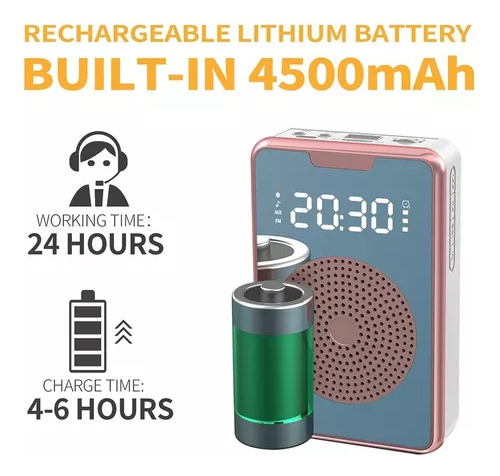 recarregável Este amplificador tem uma bateria de lítio embutida de 4500mAh, leva de 4 a 6 horas para carregar totalmente o alto-falante do microfone, mas pode reproduzir até 20 horas de amplificação ou mais até 13 horas de reprodução de música. Fonte de alimentação de luz. Amplificador Este conjunto de microfone e alto-falante é um sistema de endereço público portátil. Você pode levá-lo para vários lugares, como salas de aula, telefones de bingo e ao ar livre.