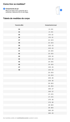 Se você tem pés largos ou grossos, escolha um tamanho maior.