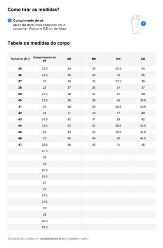 MX22.5=EU35=BR33=Comprimento do pé (do dedo do pé ao calcanhar) 22,5 cm.