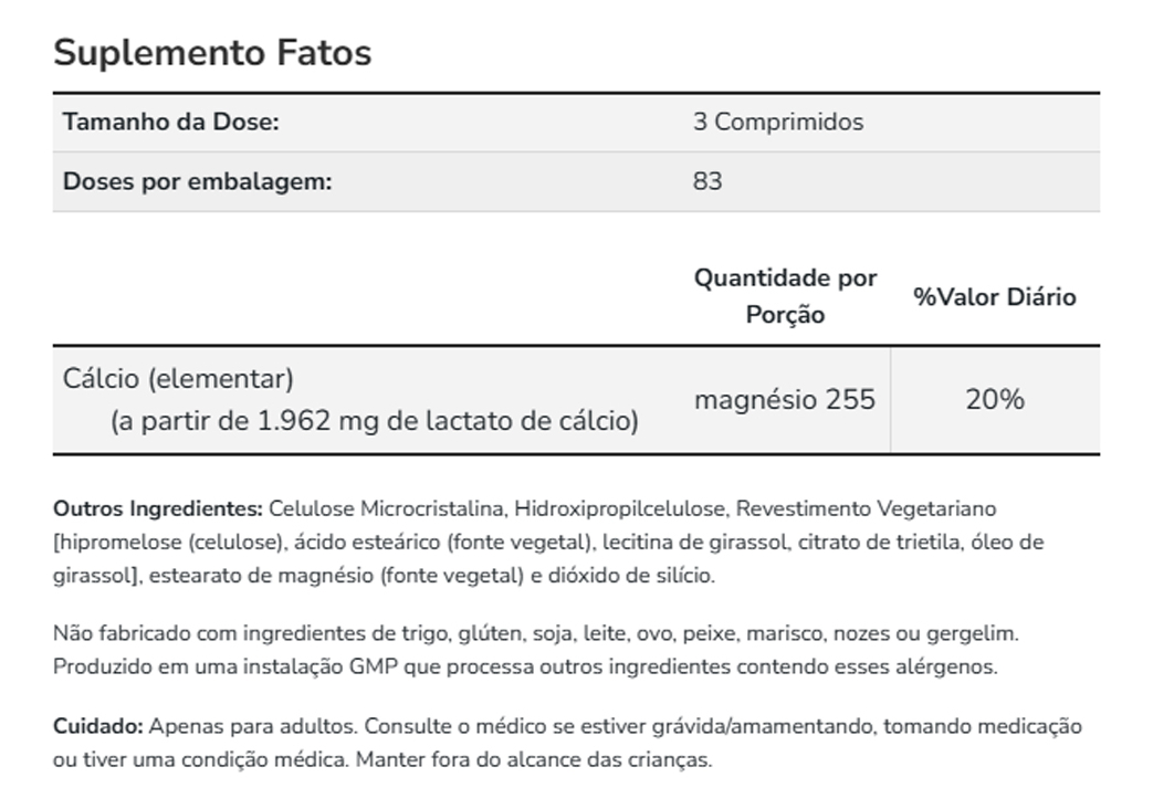 5. Elementos da Composição: Formulado com cálcio lactado de alta qualidade, este produto oferece uma fonte concentrada de cálcio, essencial para fortalecer os ossos e promover a estrutura óssea. Validade longa