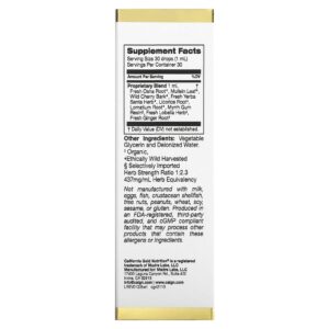 - Suplemento Líquido com Ervas Benéficas, Incluindo Raiz de Alcaçuz, Raiz de Gengibre e Casca de Cereja Silvestre