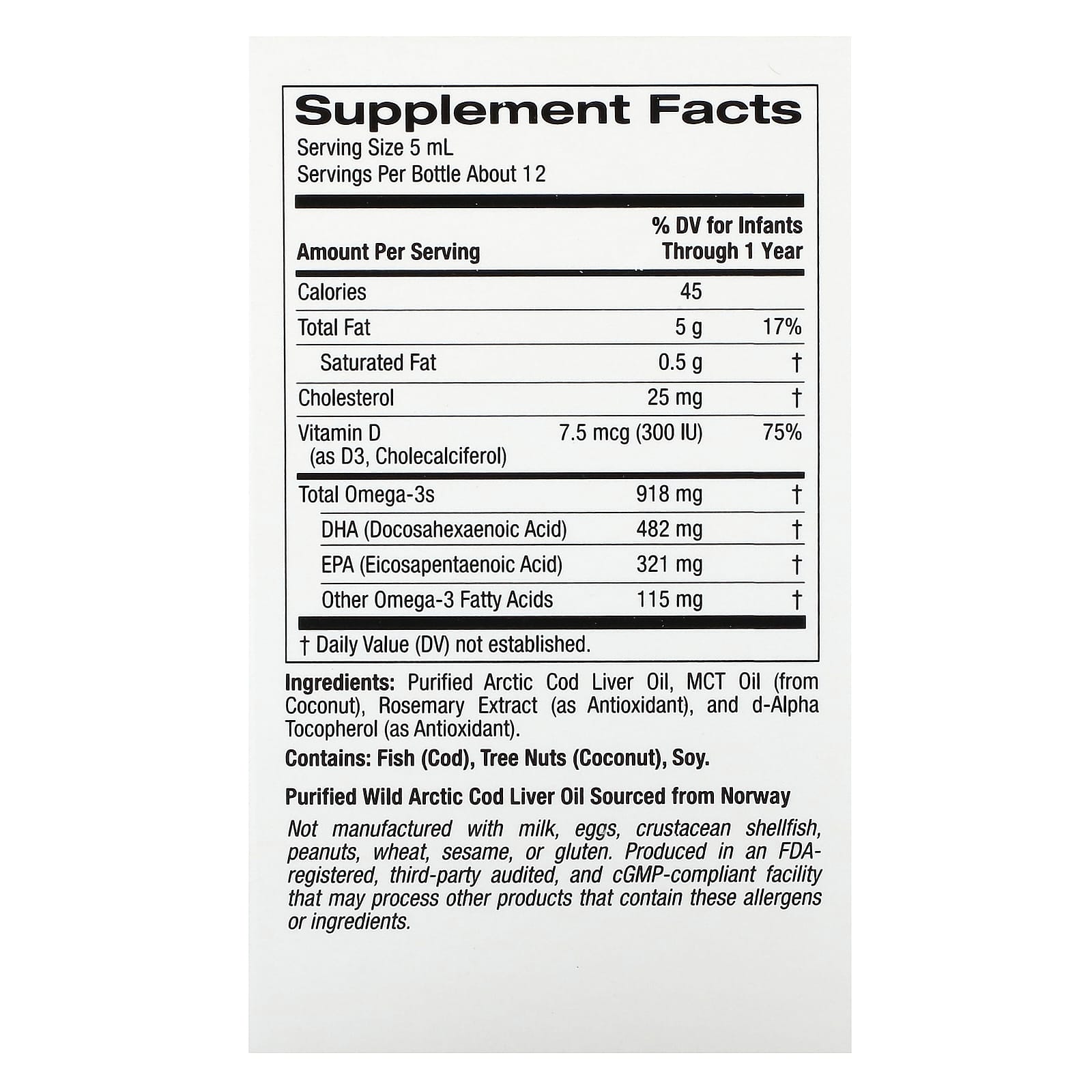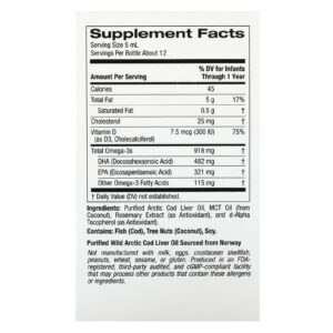 Óleo de Fígado de Bacalhau Purificado do Ártico, Óleo TCM (de Coco), Extrato de Alecrim (como Antioxidante), e Dextroalfatocoferol Não OGM (como Antioxidante).