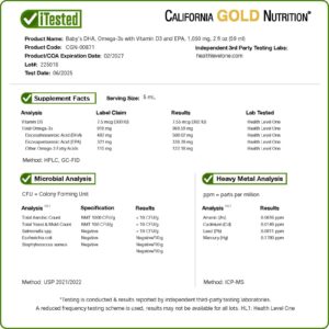 O DHA Líquido para Bebês da California Gold Nutrition BABY contém os ômegas-3 DHA e EPA na forma preferida de triglicerídeos e é proveniente de óleo de fígado de bacalhau 100% selvagem da Noruega. Cada lote é testado para não conter níveis potencialmente perigosos de contaminantes (por exemplo, metais pesados, como mercúrio) e para exceder os mais rigorosos padrões internacionais de pureza e frescor.
