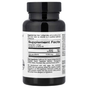 Observação: Este produto de Biotina de alta potência é para pessoas com maior necessidade e/ou deficiência de Biotina, conforme determinado por um profissional de saúde qualificado. Não tome mais de uma cápsula softgel por dia. A biotina pode interferir em certos testes laboratoriais, causando resultados incorretos. Interrompa o uso 72 horas antes de colher amostras de sangue para testes laboratoriais.