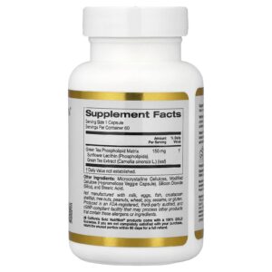 California Gold Nutrition® Chá Verde Phytosome™contém Chá Verde Greenselect® com a patente Phytosome™, que demonstrou auxiliar o metabolismo e fornecer propriedades antioxidantes.