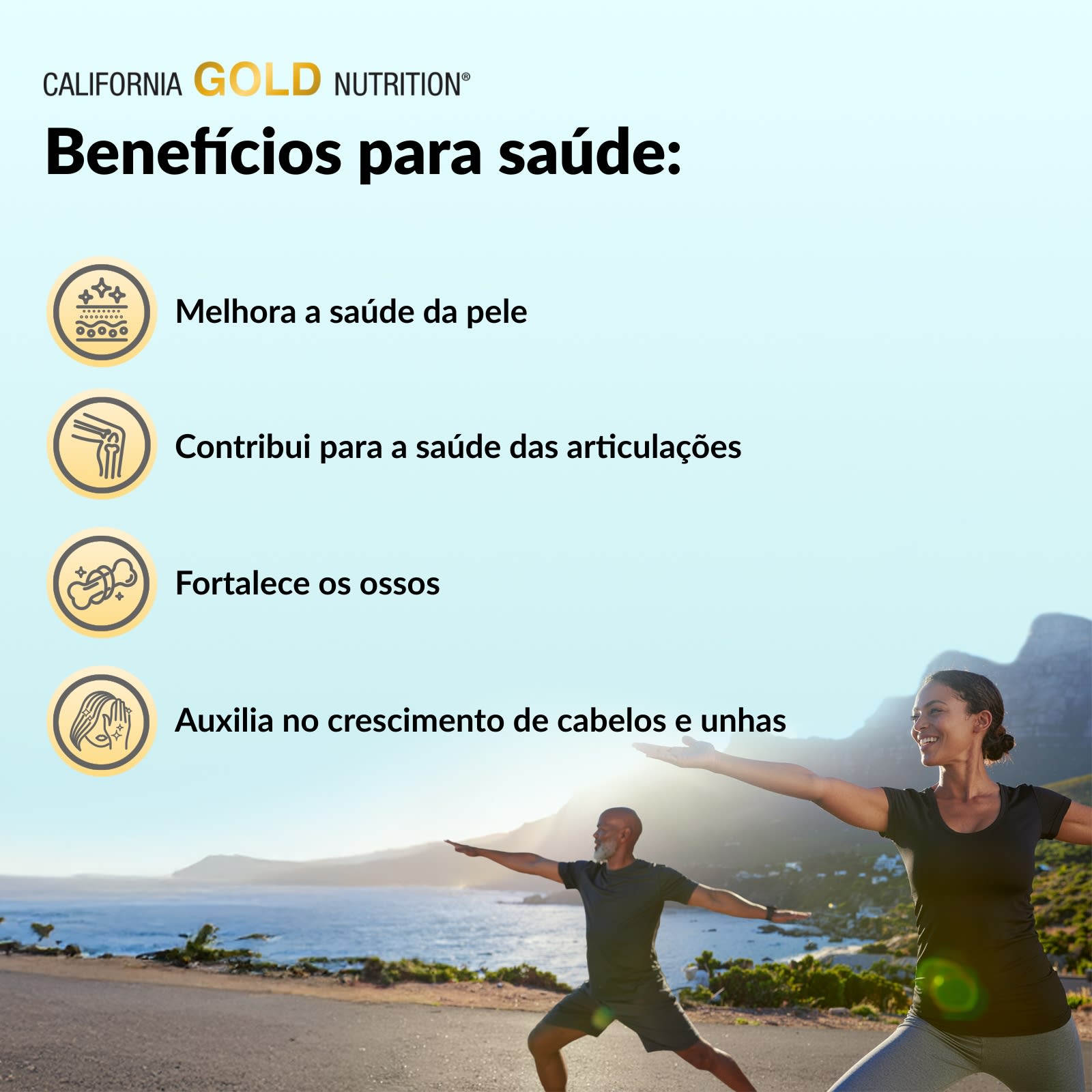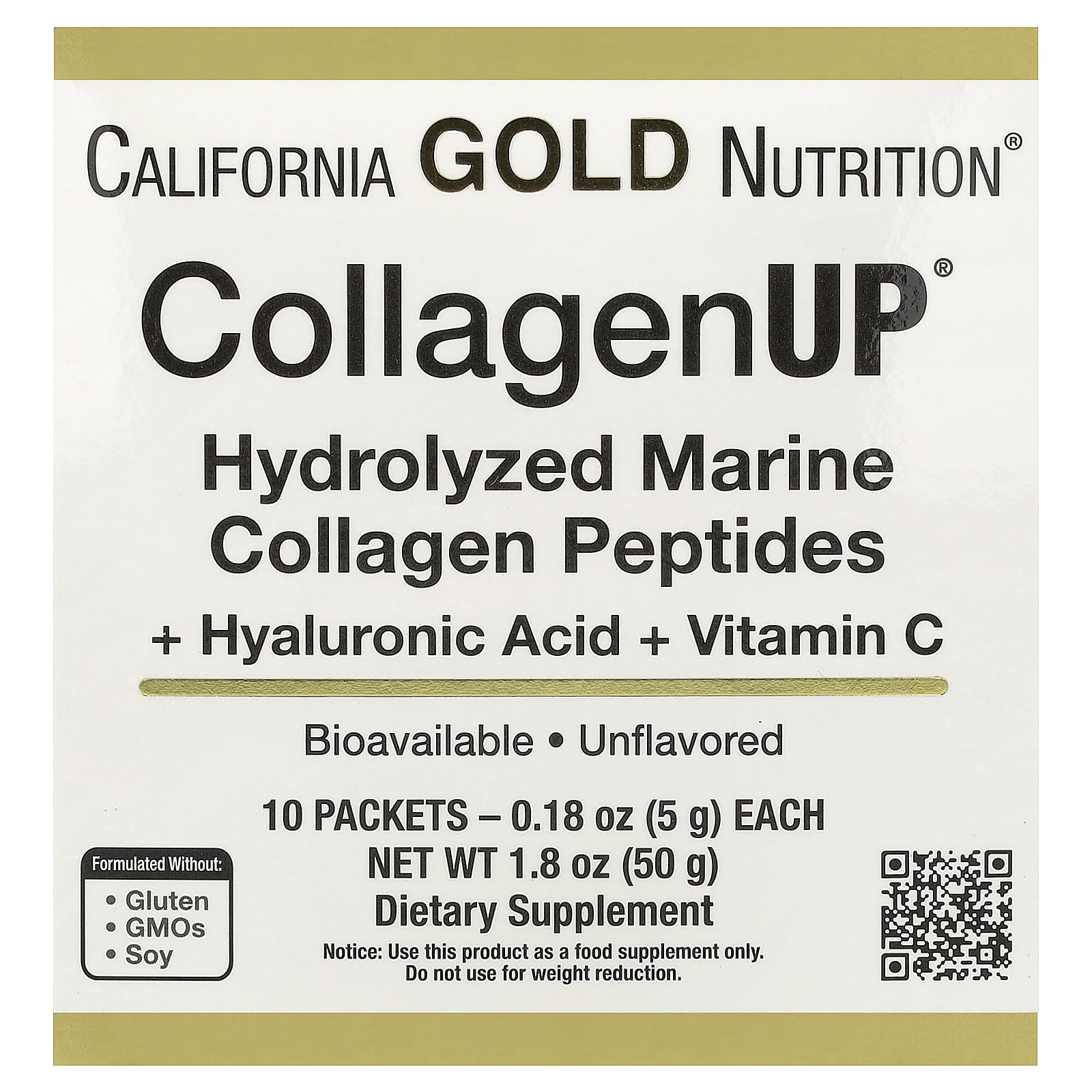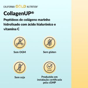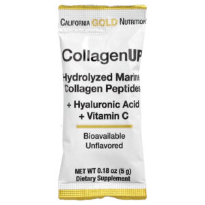 O colágeno, o ácido hialurônico e a vitamina C estão relacionados com a saúde e o bem-estar do sistema musculoesquelético. O CollagenUP da California Gold Nutrition® contém todos os três ingredientes necessários para melhorar a saúde dos cabelos, da pele, das unhas, das articulações e dos ossos.* O pó sem sabor vem em embalagens de porção individual para que você possa misturá-lo rapidamente com sua bebida favorita e ingeri-lo com facilidade em qualquer lugar.