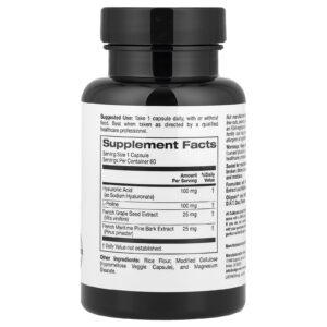 O Complexo de Ácido Hialurônico Beauty da California Gold Nutrition® contém fontes não animais de ácido hialurônico e L-prolina. O suplemento diário também contém extratos de casca de pinheiro e sementes de uva devido a seus benefícios antioxidantes e efeito sinérgico.