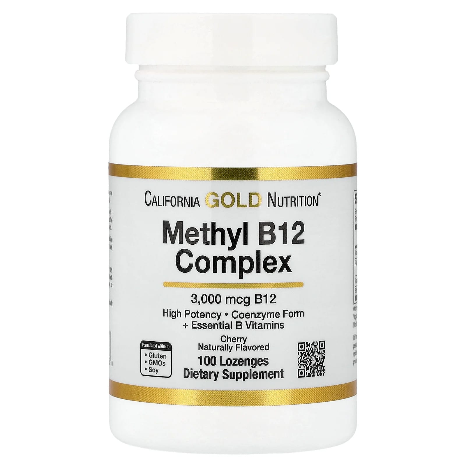 California Gold Nutrition® O Complexo de Metil B12 é uma fórmula de alta potência contendo 3.000 mcg de metil B12 bioativa, com ácido fólico, biotina e B6 em uma pastilha de ótimo sabor com sabor de cereja que se dissolve sob a língua.