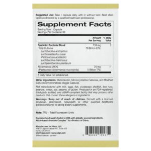 O Akkermansia Immune Complex™ da California Gold Nutrition®é formulado com 5 estirpes vivas e ativas, mais 1 estirpe pasteurizada: Akkermansia muciniphila (AKK). Cada cápsula vegetal contém 30 bilhões de UFCs de culturas no total e 5 bilhões de TFU AKK para fornecer ao corpo um número eficaz de bactérias benéficas. Essas estirpes bacterianas demonstraram auxiliar na saúde intestinal e no bem-estar digestivo, reforçar a saúde imunológica e contribuir para a saúde geral e bem-estar.* Ele contém estirpes bacterianas selecionadas que são resistentes a pH baixo e condições gastrointestinais (por exemplo, ácido, bile, pepsina e pancreatina), além de aderir às linhas de células intestinais.