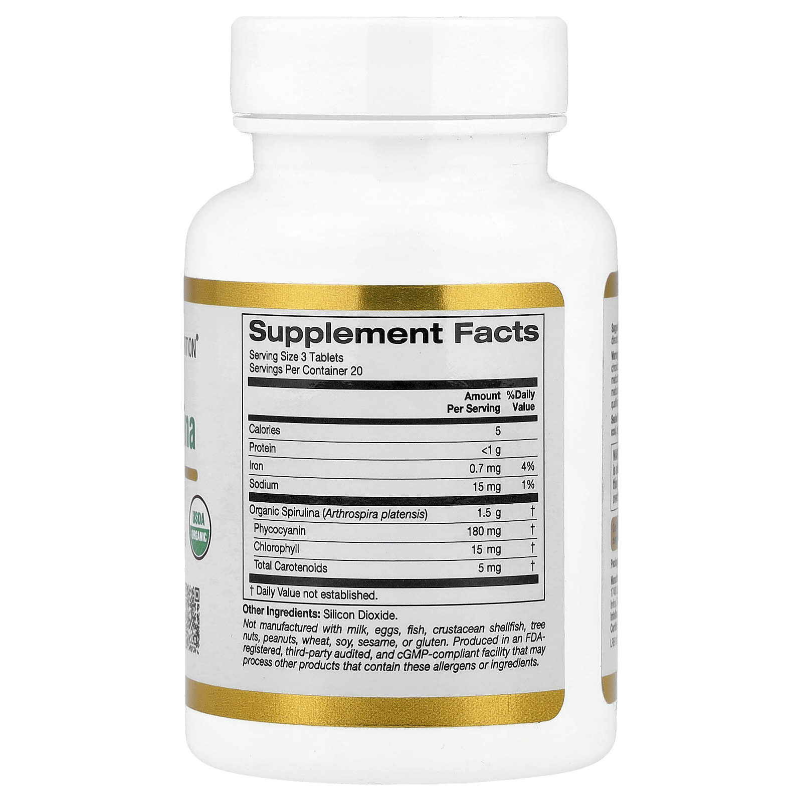 A Espirulina Orgânica da California Gold Nutrition® contém Arthrospira platensis orgânica em comprimidos. A espirulina verificada pela USP neste suplemento é fornecida pela Parry Nutraceuticals, uma empresa líder na indústria de algas verde-azuladas. Ela atende ou excede todas as especificações qualitativas e quantitativas de controle de qualidade. Quando tomado conforme as instruções, fornece quantidade suficiente para 20 dias.