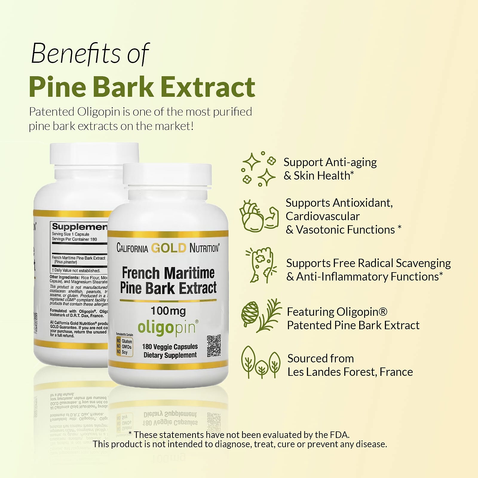 O Extrato da Casca de Pinheiro-marítimo Francês da California Gold Nutrition® contém Oligopin®, um extrato patenteado de pinheiro-marítimo proveniente da Floresta Les Landes, na França. Devido à alta concentração de procianidinas de baixa massa molecular, este é um dos extratos da casca de pinheiro-marítimo mais purificados do mercado.
