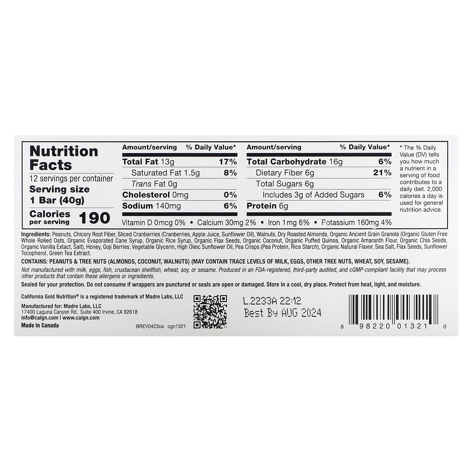 California Gold Nutrition Foods Barras de Granola com Cranberry e Amêndoa 12 Barras 40 g (14 oz) Cada